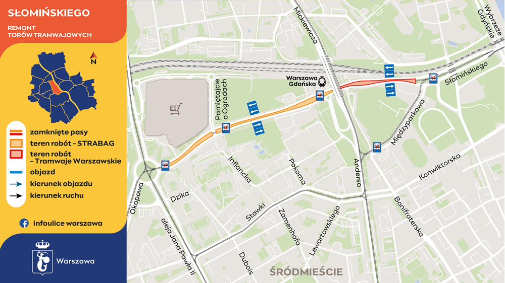 W dalszym ciągu nie kursują tramwaje linii 1, 6 i 28, a linia 18 ma zmienioną trasę (PKP Służewiec – Pl. Narutowicza). Skorzystać można z autobusów linii zastępczej Z-5 (Metro Trocka – Rondo Radosława) oraz tramwajowej 68 (Żerań FSO – Dw. Wschodni). Tramwaje wrócą na ciąg Słomińskiego, most Gdański i Starzyńskiego, zgodnie z zapowiedziami, pod koniec września.