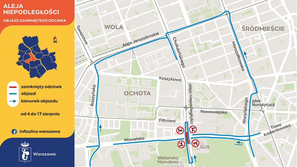 Czasowo zmieni się organizacja ruchu na skrzyżowaniu przy GUS-ie. Kierowcy nie skręcą w lewo z alei Niepodległości w Wawelską ani z Wawelskiej w aleję Niepodległości. Pasy do skrętu w lewo zostaną wygrodzone. Dla jadących aleją Niepodległości z Mokotowa zostanie wyznaczona tymczasowa zawrotka przy Filtrowej. Z kolei jadący z centrum zawrócą przy Bibliotece Narodowej – nie będą tu mogli zawrócić jadący z przeciwnego kierunku. Objazd z Ochoty do Alej Jerozolimskich będzie prowadził ulicami Krzyckiego i Raszyńską lub Trasą Łazienkowską do ronda Jazdy Polskiej, gdzie znaki będą kierowały z powrotem do alei Niepodległości. Kierowcy z Trasy Łazienkowskiej i Waryńskiego pojadą do Marszałkowskiej i dalej Alejami Jerozolimskimi do Chałubińskiego i alei Niepodległości.