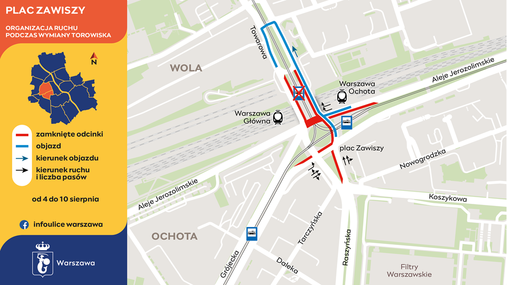 W tym samym czasie prowadzony będzie trzeci i ostatni etap prac na pl. Zawiszy, gdzie wykonawca wymienia węzeł rozjazdowy. Od 4 sierpnia tramwaje wrócą na wlot od strony Alej Jerozolimskich, a wykonawca przeniesie się na wlot po stronie Towarowej. Tramwaje jadące Alejami Jerozolimskimi będą skręcać w Grójecką do pl. Narutowicza. Wstrzymany będzie ruch tramwajów wzdłuż Towarowej między Kercelakiem a pl. Zawiszy.