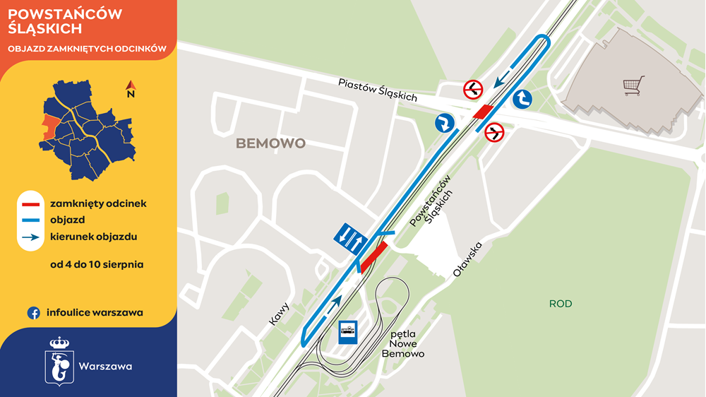 Przy pętli Nowe Bemowo zamknięty zostanie fragment jezdni ulicy Powstańców Śląskich w stronę Bielan. Kierowcy pojadą po jednym pasie w każdym kierunku na drugiej nitce. Zamknięty zostanie także środek skrzyżowania z Piastów Śląskich. Z ulicy Powstańców Śląskich nie będzie skrętu w lewo w Piastów Śląskich, a z tej ostatniej wyjazd będzie tylko w prawo. Jadący od Wrocławskiej zawrócą na tymczasowej zawrotce za skrzyżowaniem. Z kolei jadący z Bielan zawrócą przy pętli Nowe Bemowo.