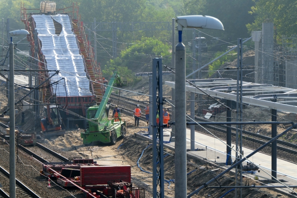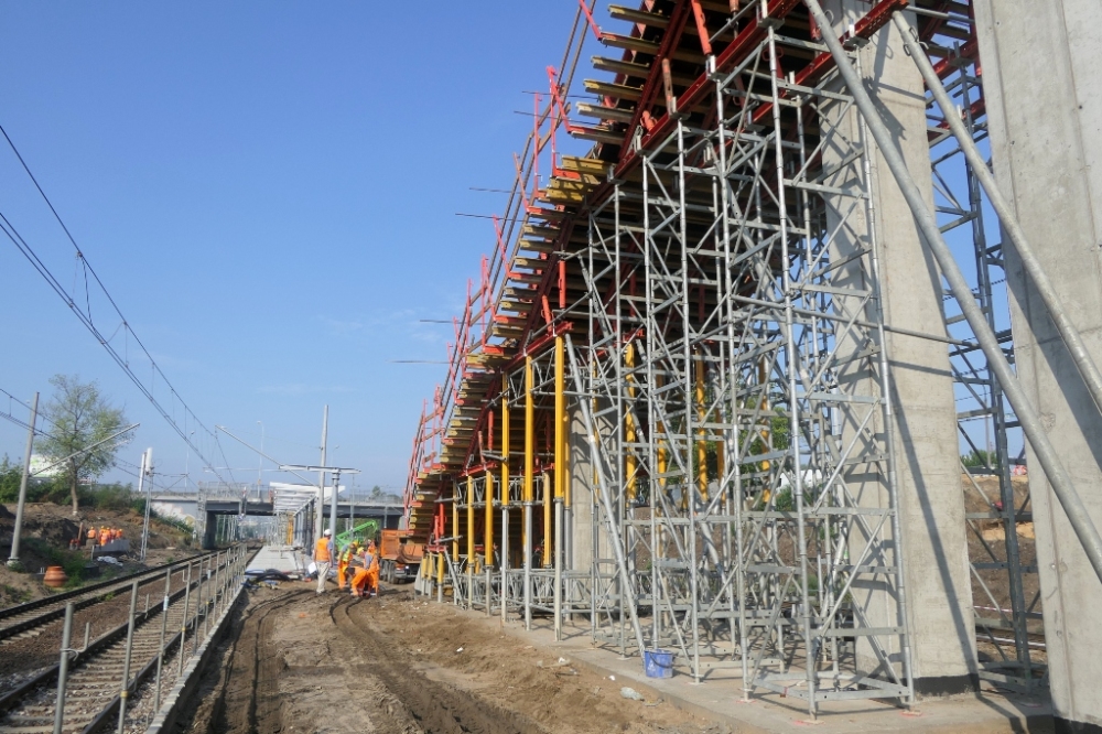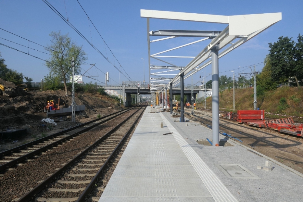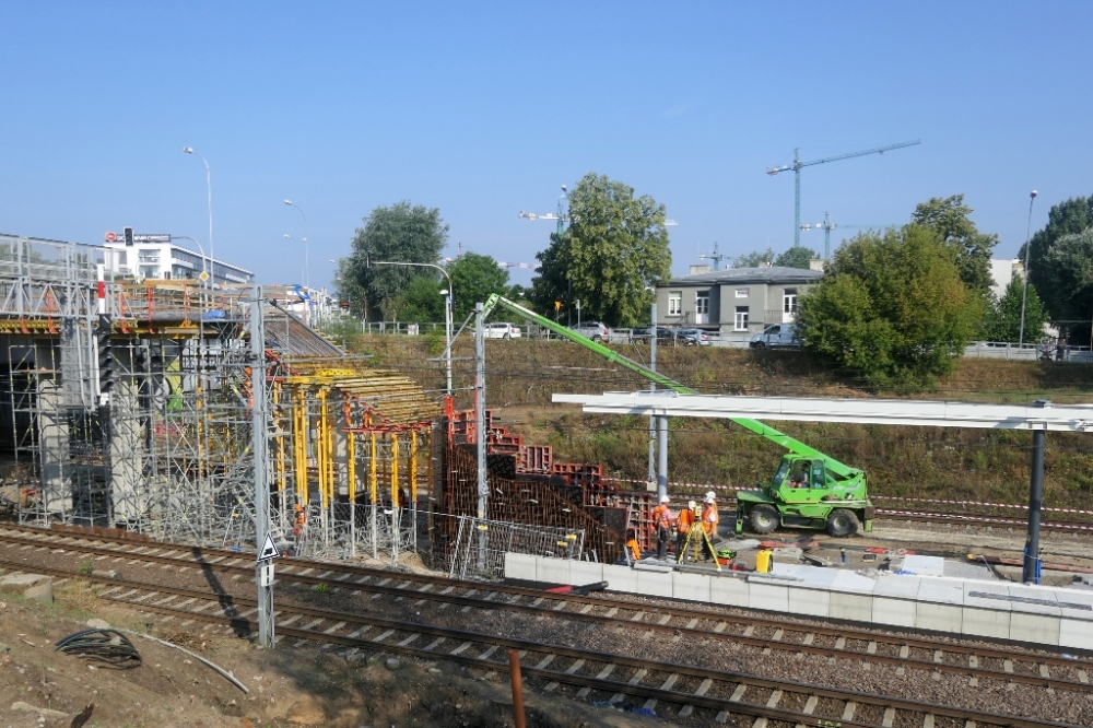 Widać konstrukcję nowego przystanku Warszawa Powązki. Na peronie układana jest antypoślizgowa nawierzchnia. Zainstalowane zostały stalowe elementy długiej wiaty. Budowane są schody i szyby windowe nowej kładki. Od strony Woli wyrównywana jest skarpa pod budowę drugiego peronu. Na plac budowy dowożone są kolejne elementy nowego przystanku. PKP PLK planują, że „jeszcze w tym roku” Warszawa Powązki zapewni podróżnym dodatkowy dostęp do kolei.
