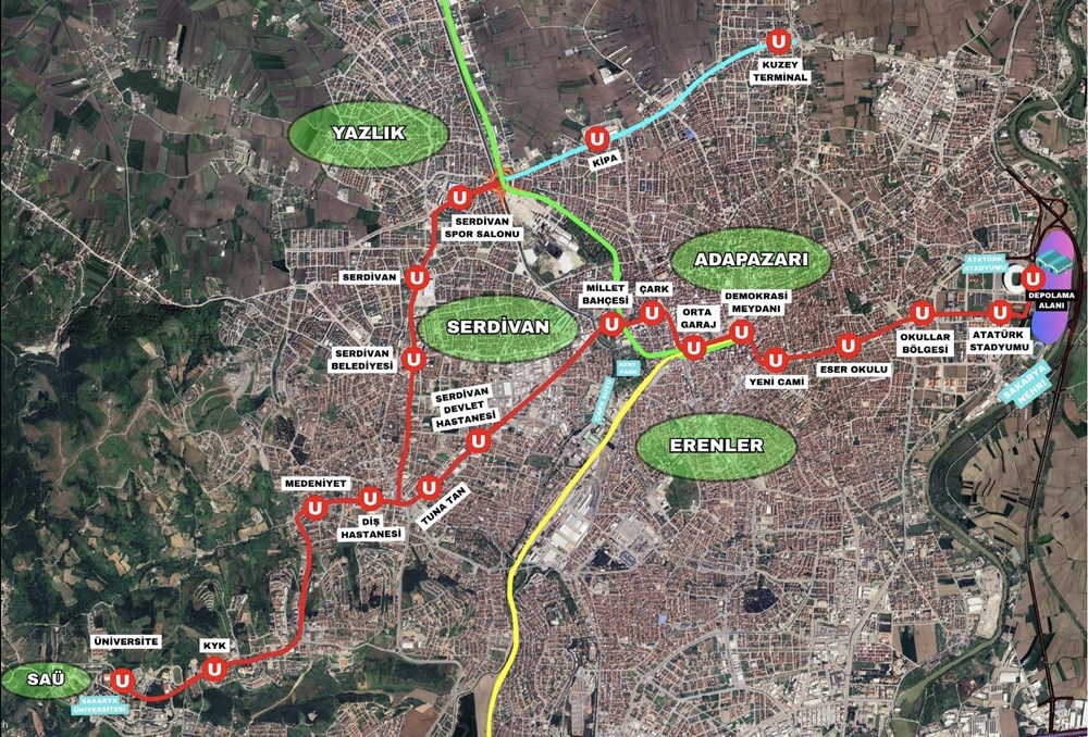 Pierwsza linia będzie mieć długość 11,9 kilometra i 15 przystanków, a jej trasa zostanie poprowadzona z kampusu uniwersytetu Sakarya, przez Aleję Uniwersytecką, Bulwar Medeniyet, Szpital Stomatologiczny, skrzyżowanie Tunatan, bulwar Muhsin Yazıcıoğlu, Aleję Çark Plac Demokracji, bulwar Atatürk i bulwar Temmuz 15 aż do stadionu Yeni Sakaryaspor Atatürk. Druga linia będzie odgałęzieniem od trasy pierwszej linii. Długość drugiej trasy określono na 3,3 kilometra. Na tej linii powstaną cztery przystanki. Trasa rozpocznie się od bulwaru Muhsin Yazıcıoğlu i będzie przebiegać obok internatu dla chłopców Serdivan, przez ulicę Mehmeta Akifa Ersoya, obok centrum handlowego Serdivan, by dotrzeć pod halę sportową Serdivan.