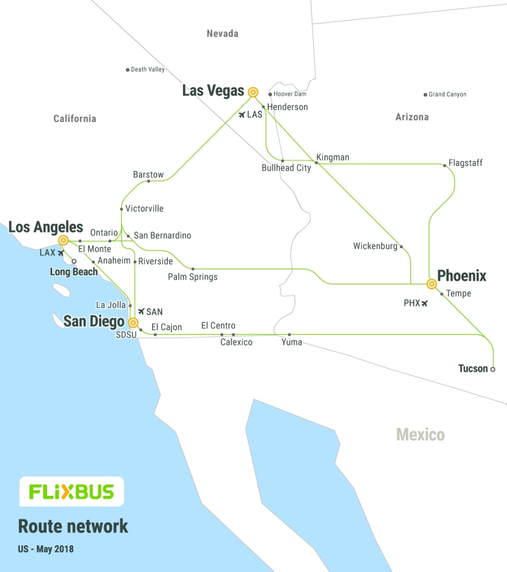 W początkowej fazie uruchomienia w USA, FlixBus zaoferuje 180 połączeń między takimi miastami jak Los Angeles, Phoenix, Las Vegas czy San Diego, które będą obsługiwane przez regionalnych partnerów autobusowych.