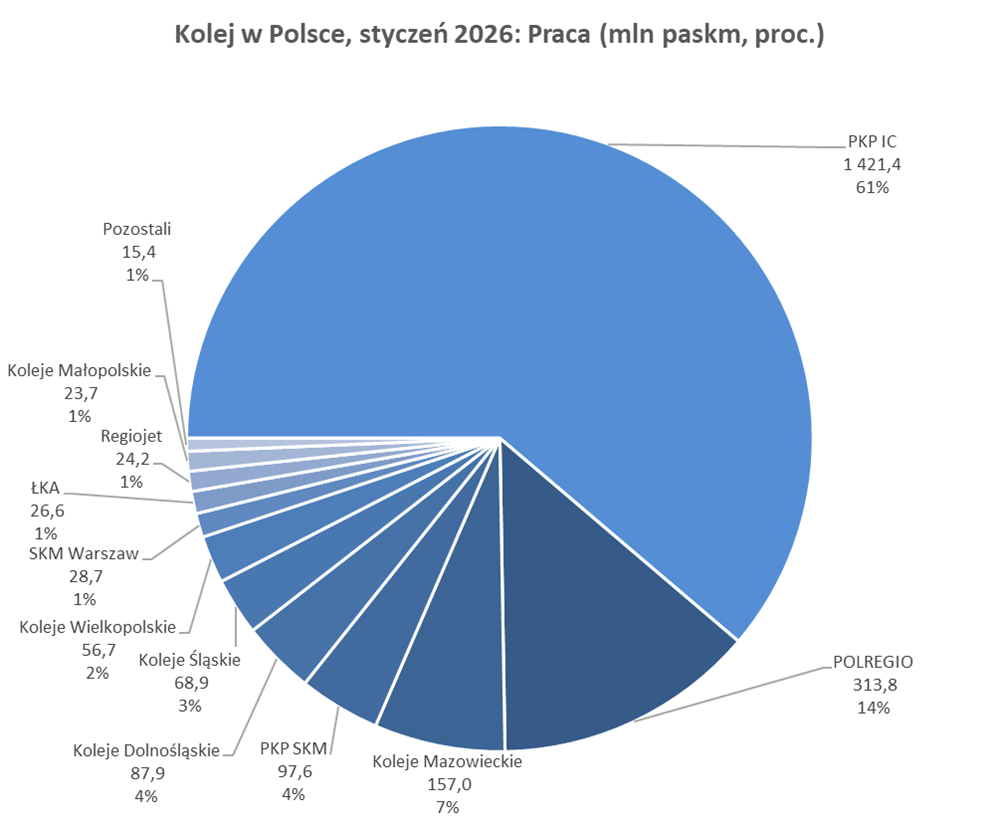 Zgodnie z tendencją sezonową, po świątecznym szczycie przewozowym w grudniu 2025 roku (36,8 mln pasażerów) liczba podróżnych w styczniu 2026 roku była niższa o ponad 1,4 mln osób (-3,9 proc.). W przypadku pracy przewozowej spadek wyniósł prawie 0,2 mld pasażerokilometrów (-7,5 proc.). W ujęciu miesiąc do miesiąca zwiększyła się natomiast wartość pracy eksploatacyjnej – o prawie 0,9 mln pociągokilometrów (+4,7 proc.).