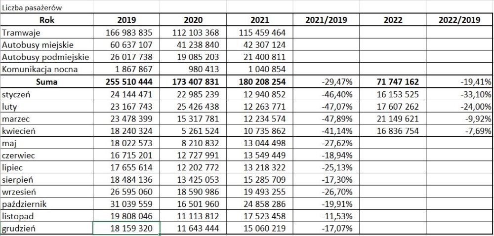 W kwietniu 2022 roku poznańskie tramwaje i autobusy przewiozły niespełna 16,837 miliona pasażerów, natomiast w roku przedpandemicznym, w tym samym miesiącu, liczba ta wynosiła 18,240 miliona pasażerów. Różnica wynosi niespełna 7,7%. ZTM nie dysponuje jeszcze wynikami przewozowymi za maj tego roku, lecz dobrą skalą tego, czy MPK Poznań wróciło już do przewożenia takiej liczby pasażerów jak przed pandemią, będą dane z pierwszego półrocza bieżącego roku.
