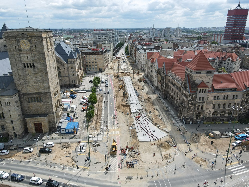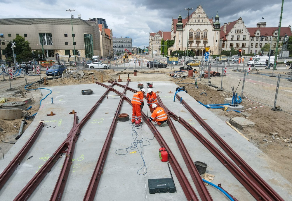 Instalacja nowego rozjazdu u zbiegu ulic Święty Marcin i Towarowej, który rozwinie potencjał sieci tramwajowej w centrum miasta, to element zaawansowanych robót związanych z powstającym na przebudowywanym obszarze nowoczesnym torowiskiem. Tory tramwajowe zamontowano już na odcinku od al. Niepodległości do ul. Kościuszki i od ul. Kościuszki do ul. Gwarnej. Na odcinku od mostu Uniwersyteckiego do al. Niepodległości gotowa jest już płyta podtorowa. Niebawem budowa takiej płyty rozpocznie się na ul. Towarowej.
