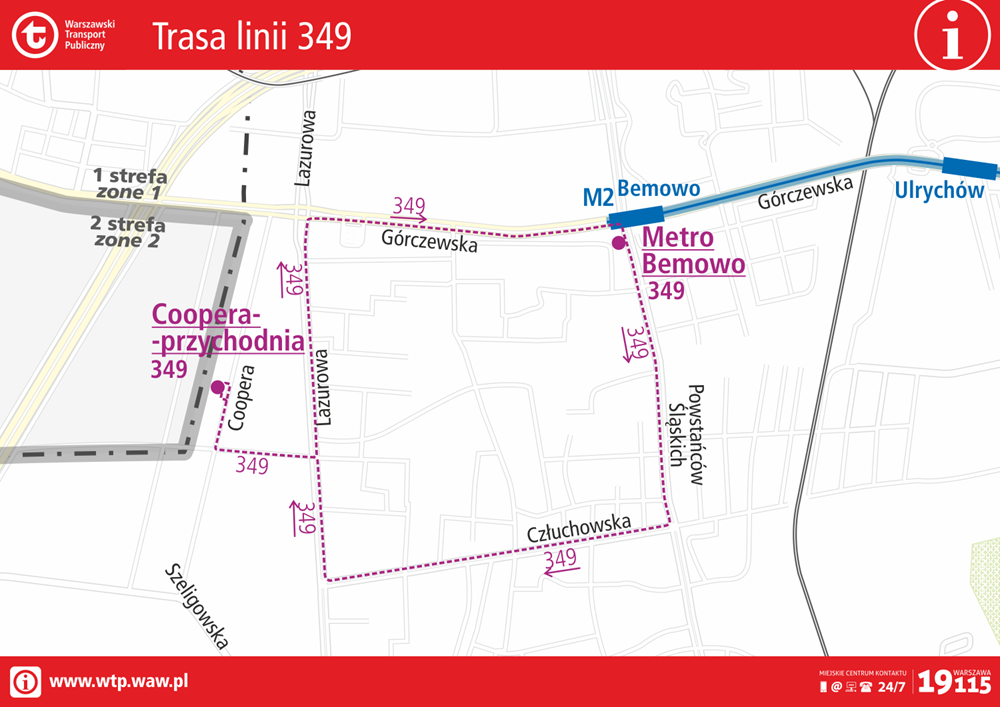 349 będzie linią okresową, która jak zaznacza ZTM, ruszyła w związku z budową metra i utrzymaniem zamknięcia ulicy Rayskiego i Coopera. Ma zapewnić obsługę komunikacyjną rejonu ulicy Batalionów Chłopskich oraz przychodni rejonowej.