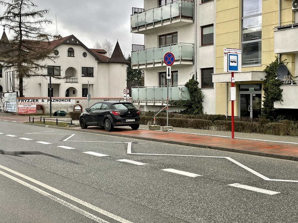 Kolejny przystanek to Coopera. Tutaj tablicę i ławeczkę udało się przykleić do ślepej ściany budynku. Czekając na autobus w tym miejscu, można podziwiać chodnik po drugiej stronie ulicy, który oczywiście świetnie sprawdza się jako parking. Sama ulica jest na tyle wąska i mocno zastawiona samochodami, że autobusy jadące w przeciwnych kierunkach nie mogłyby się minąć.