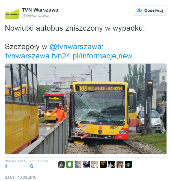 Pechowo rozpoczęło się świadczenie usług przez Mobilis w ramach nowego kontraktu ZTM-u na usługi przewozowe. Jeden z autobusów przewoźnika zderzył się 10 sierpnia z tramwajem na rondzie Wiatraczna. W wyniku zdarzenia ucierpieli pasażerowie, ale też oba pojazdy. Szkody są znaczne, ale Mobilis zapewnia, że nowo zakupiony autobus uda się odratować.