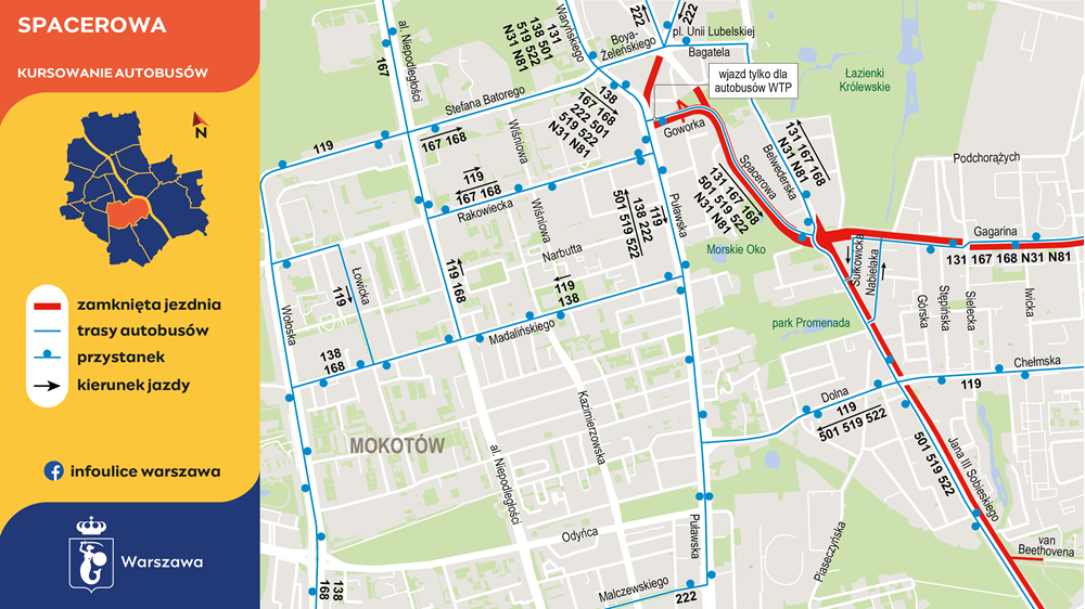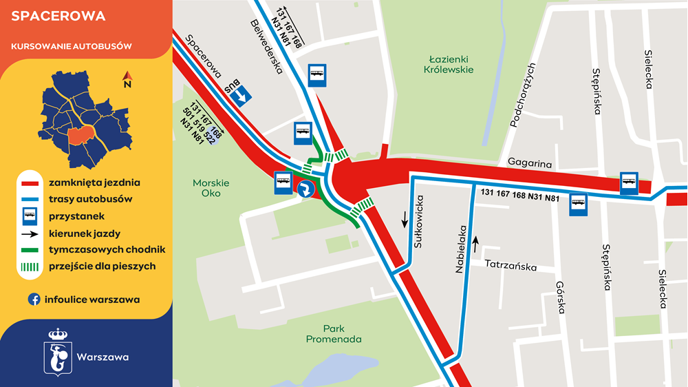 N81 – w przeciwną stronę pozostały na trasach objazdowych. Na dalszym odcinku tras: 131, 167, 168, N31 i N81 nadal kursują objazdem ulicami Nabielaka lub Sułkowicką. Autobusy 119 pozostały na dotychczasowej trasie.