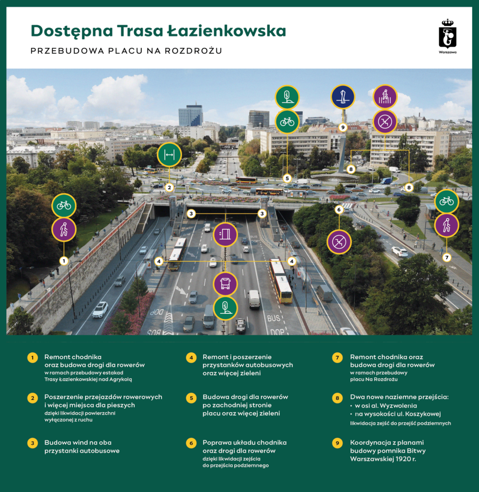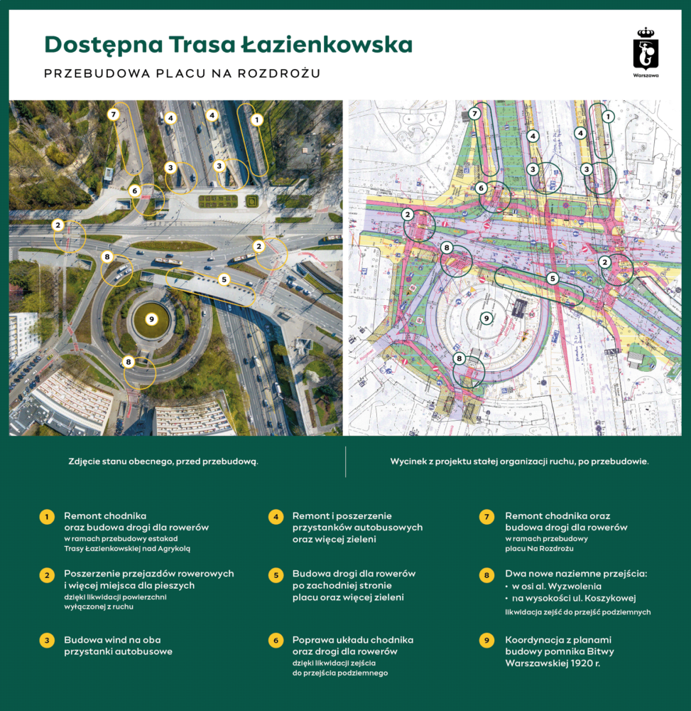 – Miasto dostępne dla wszystkich to jeden z priorytetów mojej prezydentury. Dlatego zależy mi na tym, żeby plac Na Rozdrożu był bardziej dostępny dla rodziców z wózkami, osób starszych i wszystkich, którzy korzystają z komunikacji miejskiej, ale również dla pieszych i rowerzystów. Dlatego już za rok miejsce to zmieni się diametralnie – będą tu windy na Trasę Łazienkowską, a ścieżki rowerowe i przystanki autobusowe zostaną poszerzone. Powstaną też nowe przejścia dla pieszych, będzie więcej zieleni – mówi Rafał Trzaskowski, prezydent Warszawy.