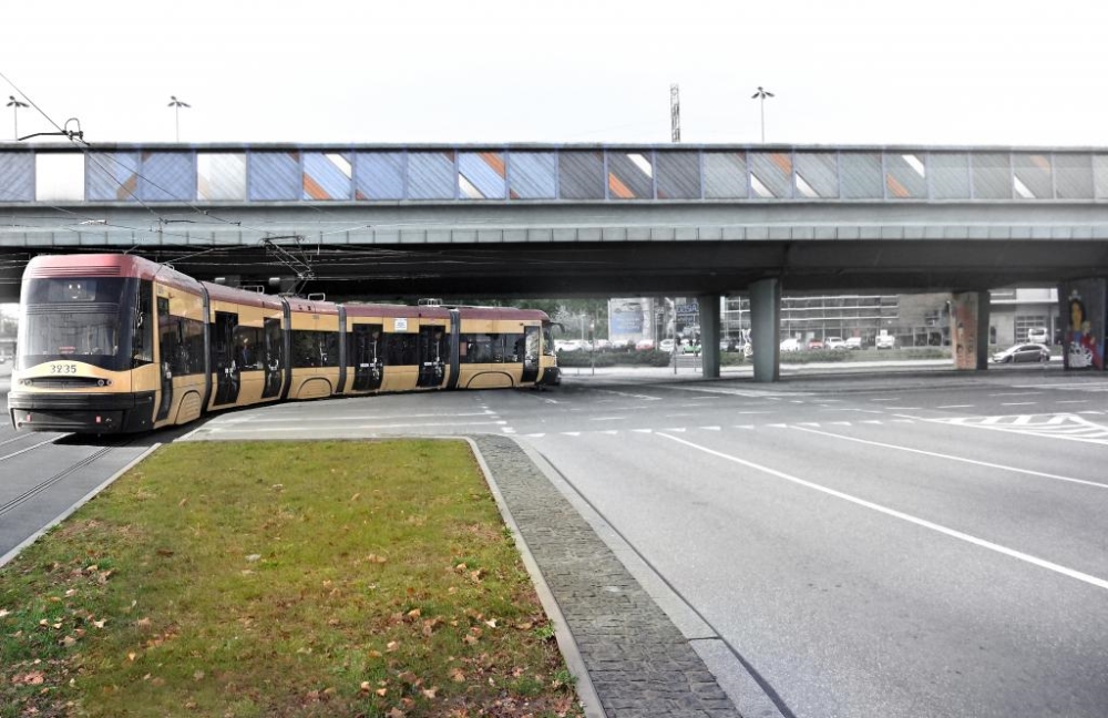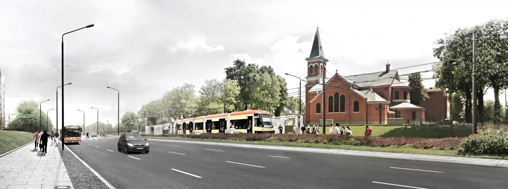 Tramwaj skręcający w al. Prymasa Tysiąclecia w trzecim wariancie (tzw. najkorzystniejszy dla środowiska)