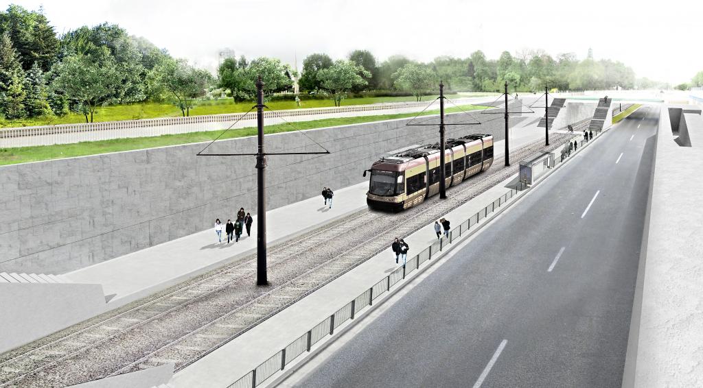 Wizualizacja rejonu Cerkwi prawosławnej, tramwaj zjeżdża na poziom -1 (wariant inwestorski i racjonalny alternatywny)