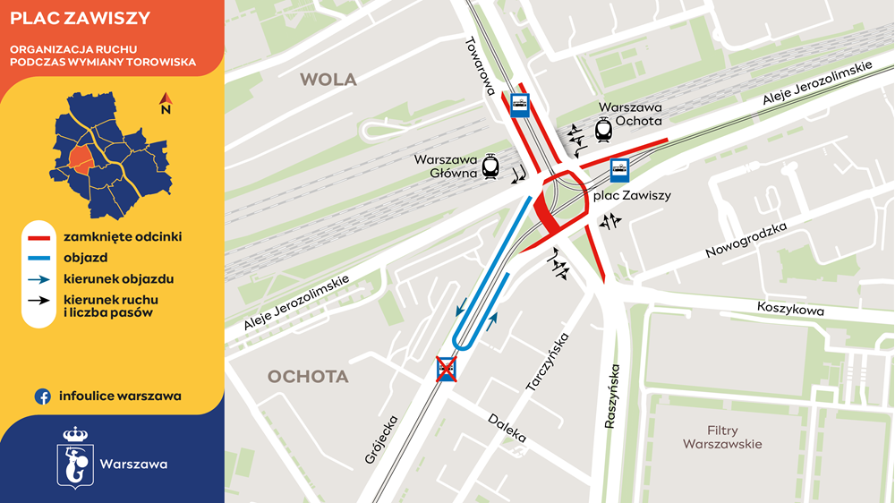 Obie jezdnie ulicy Towarowej pomiędzy placem a zawrotką na wysokości Platynowej będą zwężone o pasy przy torowisku. Na nitce Grójeckiej w kierunku placu będzie zamknięty jeden z pasów do skrętu w Towarową. O jeden pas mniej będzie także na Raszyńskiej pomiędzy Koszykową a placem Zawiszy, a także na samym rondzie – do Towarowej będą prowadziły dwa pasy, z jednego z nich będzie można skręcić w Aleje Jerozolimskie w stronę Dworca Zachodniego.