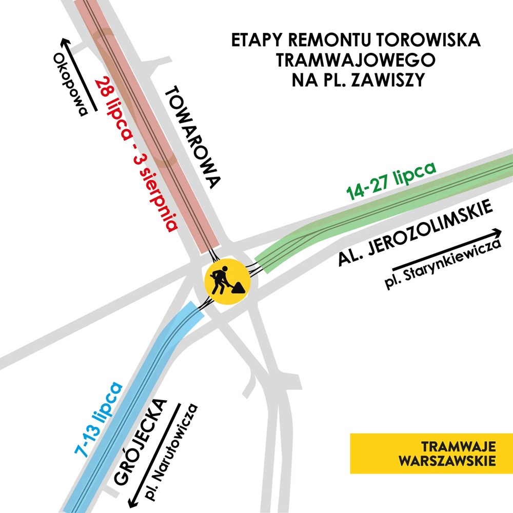 Niebawem wykonawca Tramwajów Warszawskich, firma KZN Rail, rozpocznie remont węzła rozjazdowego na pl. Zawiszy wraz ze znajdującymi się tam peronami przystankowymi. Krakowska firma dostarczy i ułoży gotowe, prefabrykowane części skrzyżowania pod torami, dzięki czemu czas trwania utrudnień w tym newralgicznym węźle będzie znacznie skrócony. Prace podzielone są na trzy etapy wykonywane po kolei. Pierwsze zmiany w kursowaniu tramwajów już od 7 lipca.