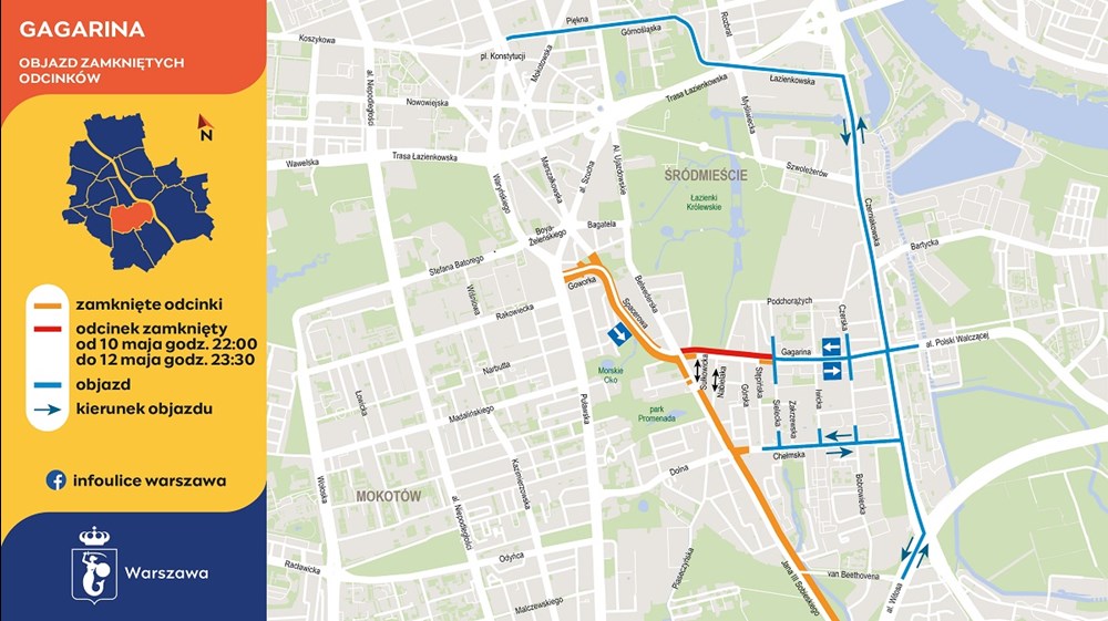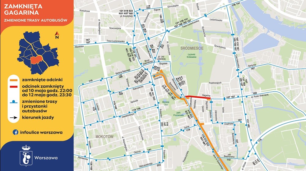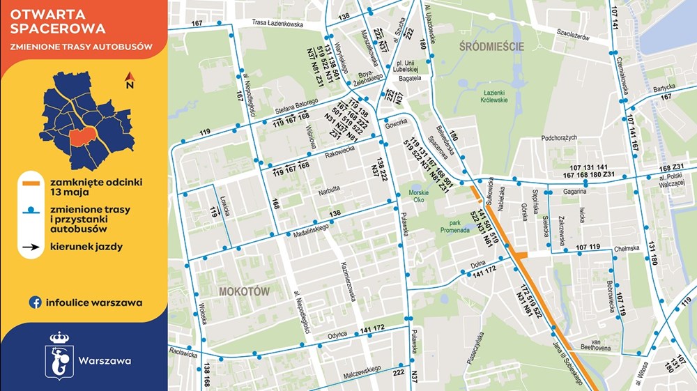Od poniedziałku, 13 maja, od początku kursowania autobusy linii: 131, 501, 519 i 522 wrócą na swoje trasy podstawowe ulicami Spacerową i Goworka w obu kierunkach. Autobusy 167 i 168 pojadą tymi ulicami na pętle Stare Bemowo/Fort Radiowo lub Woronicza. W stronę Siekierek-Sanktuarium oraz Witolina pozostaną na dotychczasowym objeździe aleją Niepodległości, Stefana Batorego, Waryńskiego i Puławską. Autobusy linii 119 do pętli Rakowiecka-Sanktuarium pojadą Sielecką, Gagarina, Spacerową, Goworka, a w stronę Wiśniowej Góry – Stefana Batorego, Waryńskiego, Puławską, Goworka, Spacerową do Gagarina i Sieleckiej. Autobusy linii nocnych N31 i N81 na Dworzec Centralny także pojadą Spacerową i Goworka.