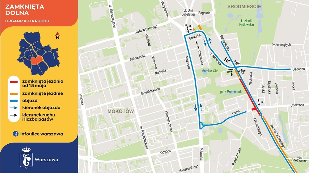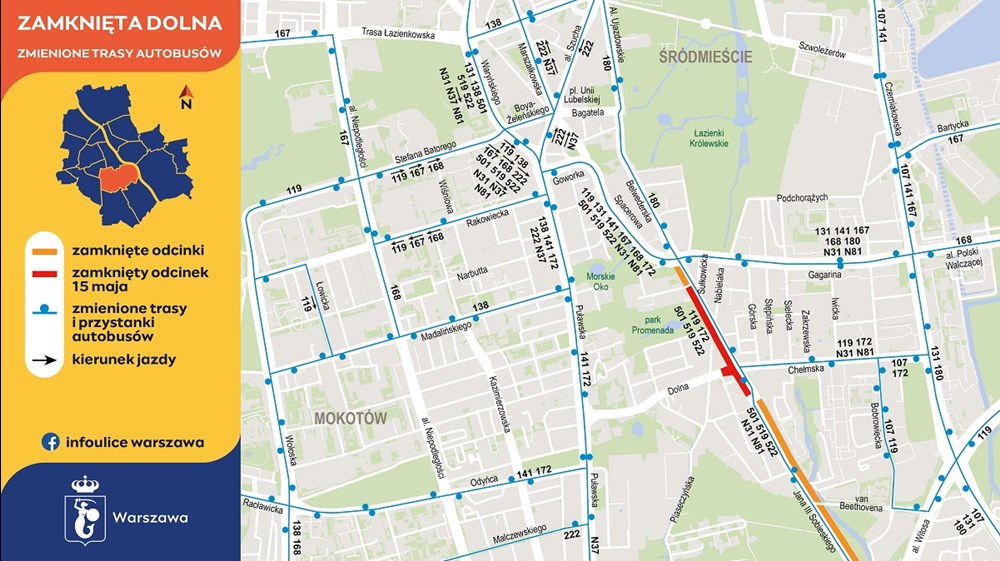 Od środy, 15 maja, na swoje trasy podstawowe w obu kierunkach wrócą autobusy linii 107, czyli ulicami Chełmską i Czerniakowską oraz nocne N31 i N81 – Gagarina, Czerniakowską i Chełmską. Przestaną kursować autobusy zastępczej linii nocnej Z31. Zmieni się trasa linii 119 – w stronę Rakowieckiej-Sanktuarium autobusy pojadą ulicami: Chełmską, Belwederską, Spacerową i Goworka, a w stronę Wiśniowej Góry będą kursowały Belwederską i Chełmską. Autobusy 141 ominą (w obu kierunkach) zamkniętą ulicę Dolną jadąc ulicami: Gagarina, Spacerową, Goworka i Puławską. Zmieni się także trasa autobusów linii 172 – dojadą (i potem ruszą w przeciwnym kierunku) do pętli przy ulicy Chełmskiej (nieopodal Czerniakowskiej). Autobusy nie będą jeździły ulicą Dolną tylko pojadą Puławską do Goworka, Spacerowej i Belwederskiej, aby Chełmską dojechać do pętli.