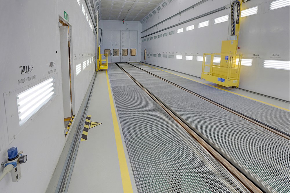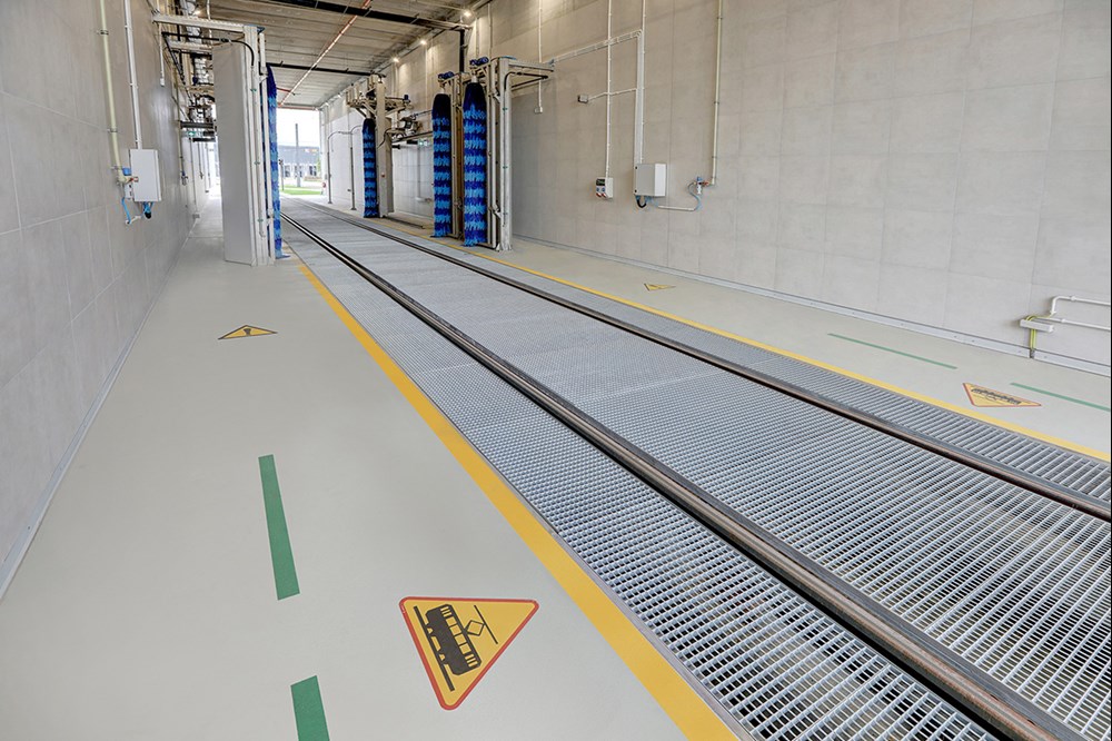 W odpowiedzi na te potrzeby, m.in. w Hali Remontowej oraz w Hali Obsługi Codziennej, w tym w kanałach rewizyjnych, w myjniach oraz na stanowisku do czyszczenia wnętrz tramwajów, przewidziano zastosowanie powłoki Flowcoat SF41 w wersji przeciwpoślizgowej.