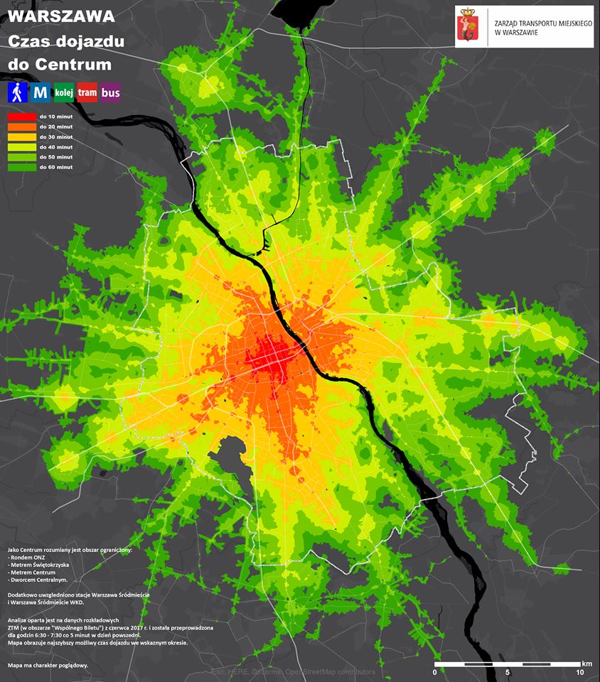 To już kolejna interesująca mapa przygotowana przez Florczaka z Działu Transportu Aglomeracyjnego ZTM. Tym razem pokazuje ile czasu zajmuje dojazd do centrum miasta (które zostało określone jako kwadrat między metrem Centrum, metrem Świętokrzyska, Dworcem Centralnym i Rondem ONZ z każdego punktu stolicy z wykorzystaniem transportu publicznego. Pod uwagę brane są właściwie wszystkie „niesamochodowe” formy transportu, w tym kolej i spacer. Dane są wzięte z rozkładów jazdy z godzin porannych (6.30–7.30) z czerwca tego roku.