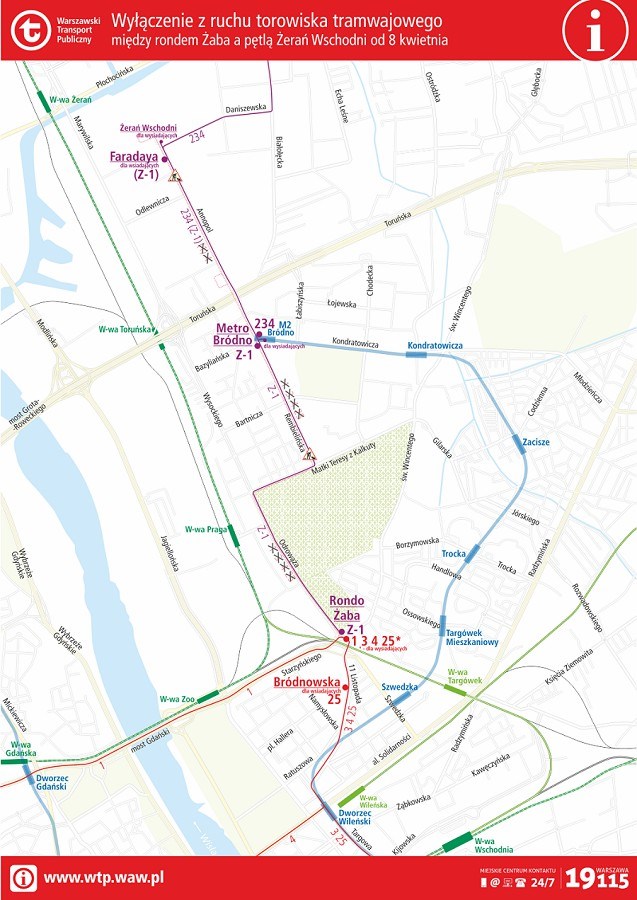 Od dzisiaj (8 kwietnia) tramwaje linii 1, 3, 4 oraz 25 kursują na trasach skróconych – tylko do ronda Żaba. Tam zamieniają się numerami i jadą dalej po trasie innej linii; np. „jedynka” z placu Narutowicza, od ronda Żaba pojedzie jako „trójka” jej trasą na Gocławek. Tramwaje linii 25 dojadą tylko do ronda Żaba.