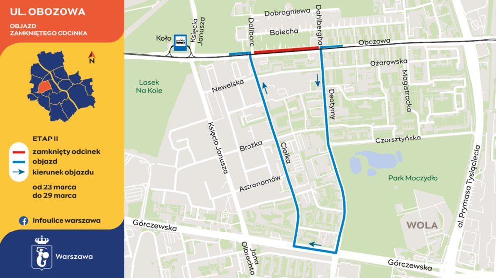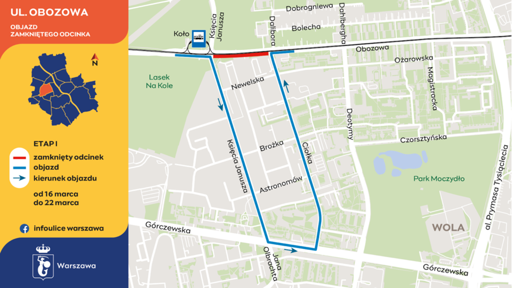 Pierwszy etap prac rozpocznie się w nocy z piątku na sobotę, z 15 ma 16 marca i potrwa do piątku, 22 marca, do końca dnia. Zamknięta zostanie jezdnia ulicy Obozowej w kierunku alei Prymasa Tysiąclecia od skrzyżowania z ulicą Księcia Janusza do ulicy Ciołka. Zakaz wjazdu na ten fragment nie będzie dotyczył dojazdu do posesji.