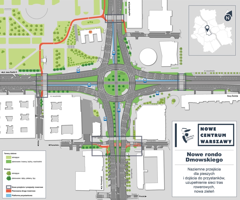 Pojawi się też zieleń. Przewidziano w sumie posadzenie 60 drzew – część w misach, by można było je potem przesadzić. Tym bardziej, że szykowana jest kolejna duża inwestycja w postaci przebudowy linii średnicowej. – Docelowo w ramach modernizacji linii średnicowej zostanie przebudowane całe rondo. Będą możliwe przejścia w bezpośrednim sąsiedztwie samego ronda – mówi Michał Olszewski. Samo rondo miałoby zmienić się w bardziej kompaktowe skrzyżowanie.