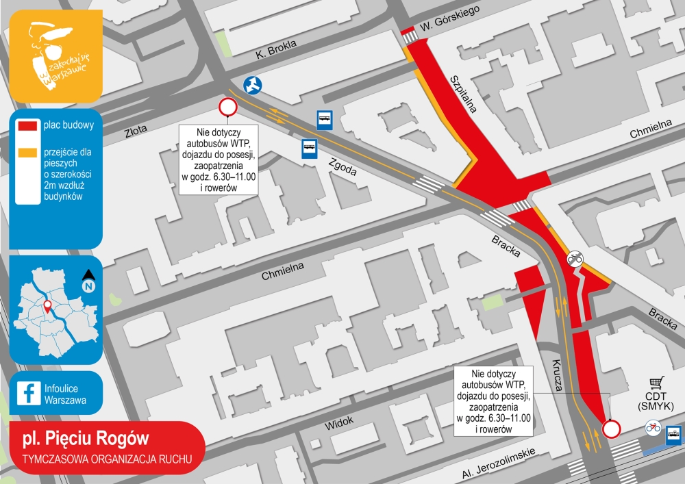 Prace realizuje Strabag za kwotę ok. 14,8 mln zł. – Dzisiaj zaczynamy nowy rozdział rozwoju Warszawy. Cieszę się bardzo, że rozpoczynają się prace przy placu Pięciu Rogów, które do jesieni zmieni swoje oblicze – mówi Rafał Trzaskowski, prezydent Warszawy. W I etapie ruch w ciągu Szpitalnej jest zamknięty, natomiast możliwy jest przejazd w ciągu ul. Zgody w obu kierunkach.
