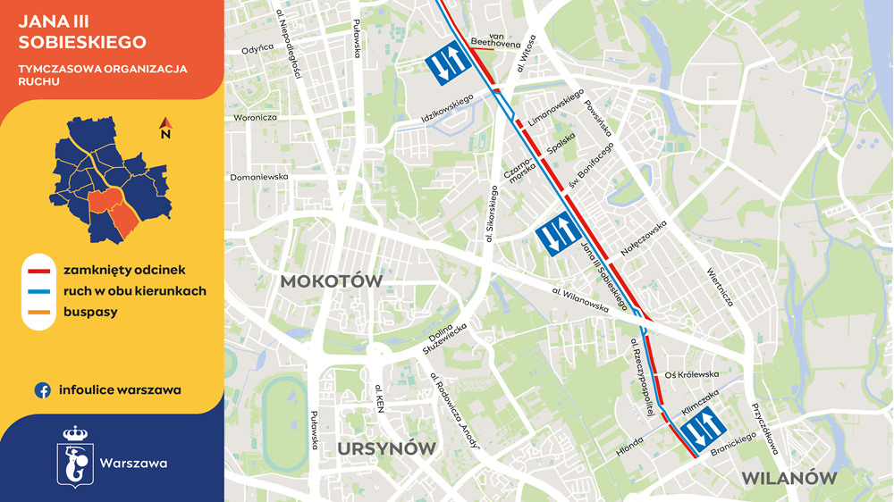 Kolejny etap w budowie torowiska na trasie do Wilanowa to prace na ulicy Jana III Sobieskiego – pomiędzy św. Bonifacego i Dolną. W tym celu wykonawca w nocy z 7 na 8 czerwca, zajmie pas dla autobusów w kierunku centrum. Kierowcy wciąż będą mieli do dyspozycji dwa pasy ruchu – po jednym w każdym kierunku.
