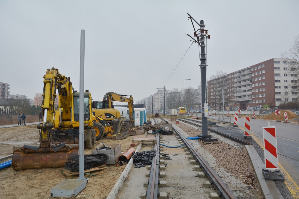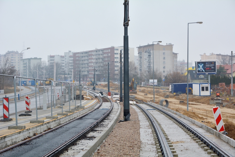 Na trasie ułożone są już wszystkie szyny. Na pętli zamontowano już sieć płaską. – Skończyliśmy prace konstrukcyjne. Na torach teraz rozkładamy teraz tkaninę geosyntetyczną i substrat dla zielonego torowiska. W połowie kwietnia powinniśmy zająć się rozkładaniem trawy na tym torowisku – mówi Maciej Dutkiewicz, rzecznik Tramwajów Warszawskich. Wszystko wskazuje na to, że będzie to ostatnie torowisko trawiaste w Warszawie – kolejne mają być już wyłożone rozchodnikiem. – Chodziło o zachowanie spójności ze starszymi odcinkami zbudowanymi w tej technologii, które sięgają mostu przez Wisłę – mówi Maciej Dutkiewicz, rzecznik Tramwajów Warszawskich. Z tego względu też na nowej trasie ustawiono słupy trakcyjne ze zdobieniami, które w tym miejscu wyjątkowo mało pasują do otoczenia.
