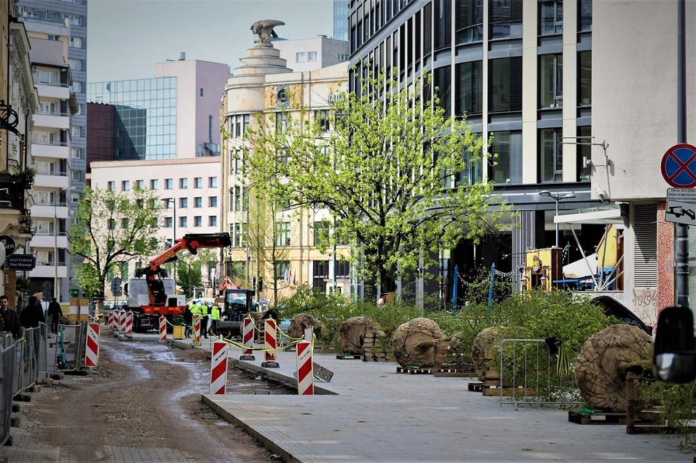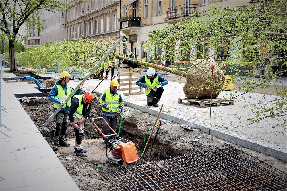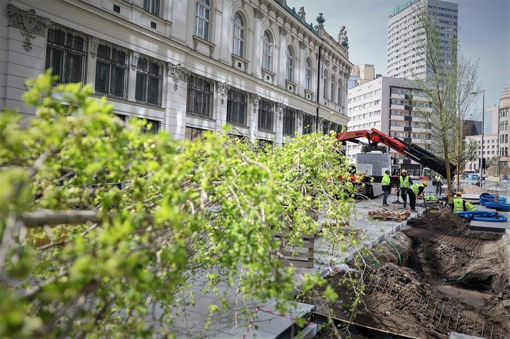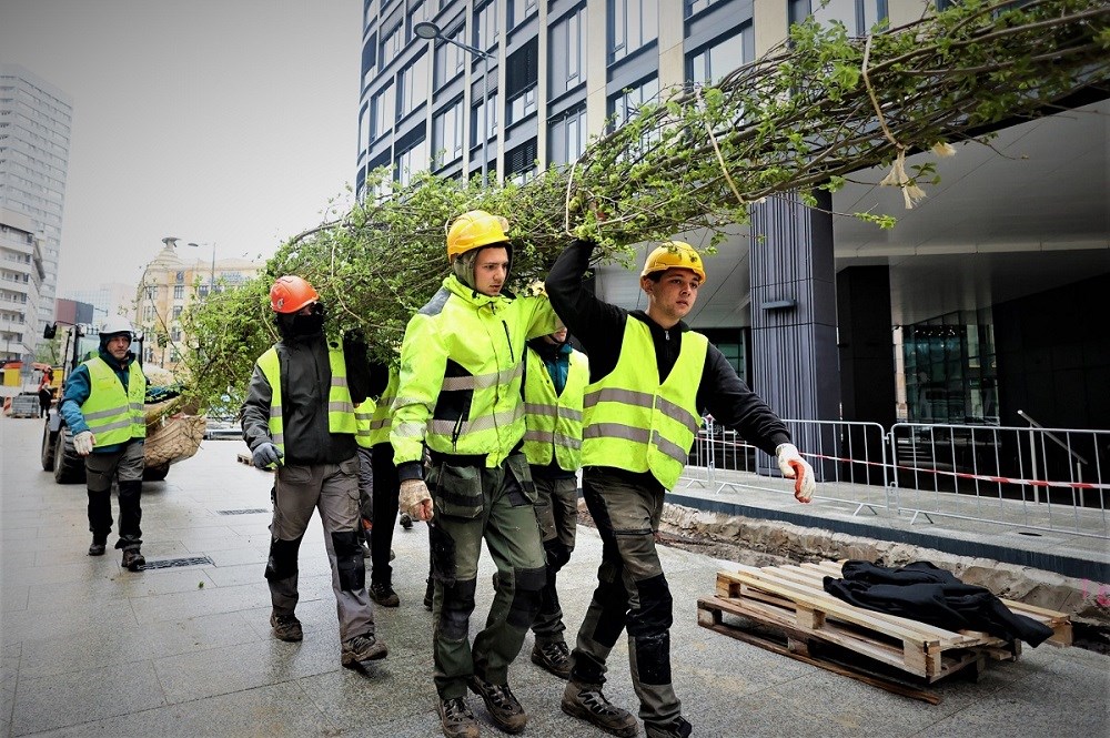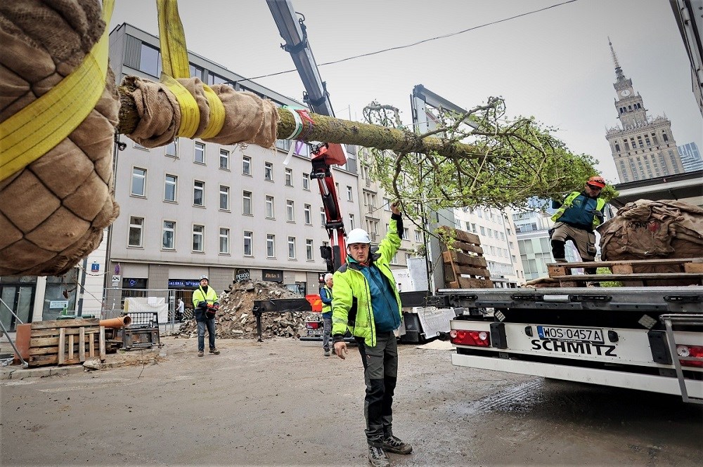 Trwa sadzenie 11 okazałych, blisko 9-metrowych wiązów przy ul. Zgoda. Kiedy zakończą się wszystkie nasadzenia, takich drzew będzie tu aż 167. To kolejny etap rewitalizacji w kwartale ulic Złotej, Zgoda, Sienkiewicza i Jasnej – w ramach projektu Nowe Centrum Warszawy.