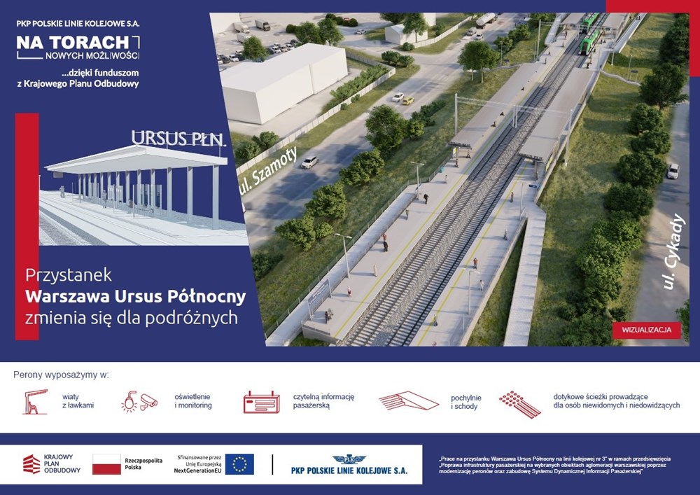 Przebudowa przystanku Warszawa Ursus Północny, realizowana przez firmę Primost Południe, jest dofinansowana ze środków KPO w ramach projektu „Poprawa infrastruktury pasażerskiej na wybranych obiektach aglomeracji warszawskiej poprzez modernizację peronów oraz zabudowę Systemu Dynamicznej Informacji Pasażerskiej”