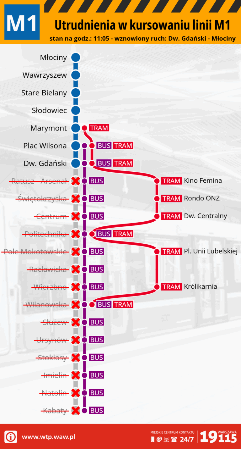 Z przyczyn technicznych występują utrudnienia w kursowaniu pociągów metra na liniach M1. Uruchomione zostają autobusowe i tramwajowe linie zastępcze kursujące na trasie: