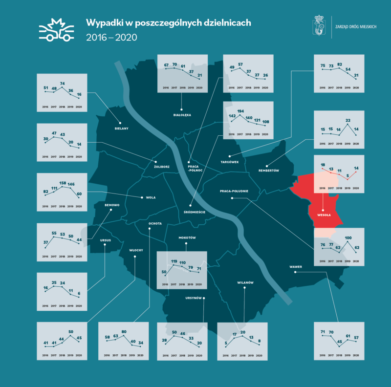 Biorąc pod uwagę dzielnice, najwięcej – 108 – wypadków wydarzyło się w Śródmieściu. W zdarzeniach drogowych w tej części miasta zginęły 3 osoby, a 118 zostało rannych. Następne w kolejności były Mokotów i Praga-Południe, ale ze znacznie niższymi liczbami wypadków – odpowiednio 71 (6 zabitych i 77 rannych) i 62 (2 ofiary śmiertelne i 69 rannych). Dane w tej kategorii są o wiele lepsze niż za 2019 r. – względem niego w 2020 r. tylko w Wesołej zwiększyła się liczba wypadków, zaś w pozostałych 17 dzielnicach zmalała. Wyróżnia się zwłaszcza Wola, która w 2019 r. była dzielnicą z największą liczba wypadków, a rok później liczba ta spadła ponad dwukrotnie.
