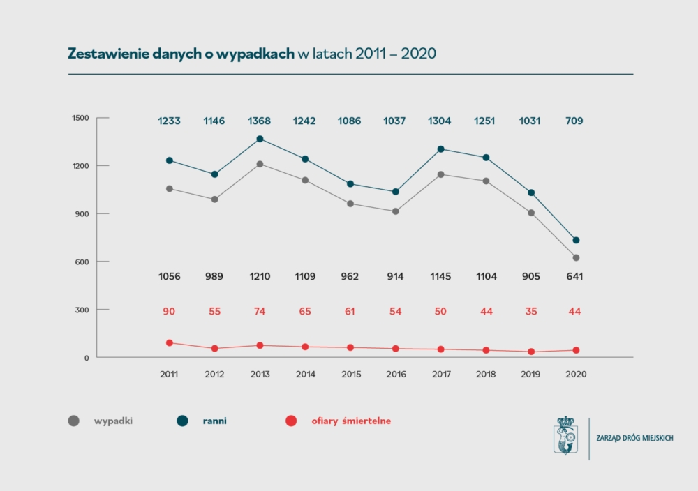 Pandemię i spowodowany nią lockdown widać w statystykach. Prawie wszystkie zbiorcze dane dotyczące wypadków były w 2020 r. znacznie niższe niż w latach poprzednich. Są one odzwierciedleniem mniejszego ruchu na ulicach, które szczególnie wiosną i jesienią pustoszały ze względu na przejście przez znaczną część osób na zdalny tryb pracy - tłumaczy ZDM.