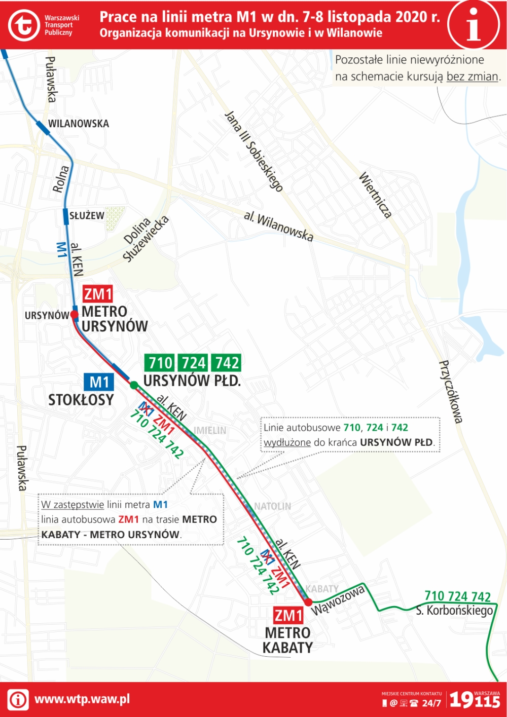 Pasażerowie będą mogli skorzystać z zastępczej komunikacji autobusowej. Trasa linii ZM1: Metro Kabaty – al. Komisji Edukacji Narodowej – Metro Ursynów. Ponadto zmienią się trasy autobusów linii: 710, 724 i 742, dzięki czemu nadal będzie można nimi dojechać bezpośrednio do metra, do stacji Stokłosy: 710, 724, 742: PIASECZNO (KOŚCIELNA) / PIASECZNO (GERBERA) / GÓRA KALWARIA (RYNEK) – … – Wąwozowa – al. Komisji Edukacji Narodowej – Ciszewskiego – URSYNÓW PŁD. (powrót: URSYNÓW PŁD. – al. Komisji Edukacji Narodowej – Wąwozowa – (…).