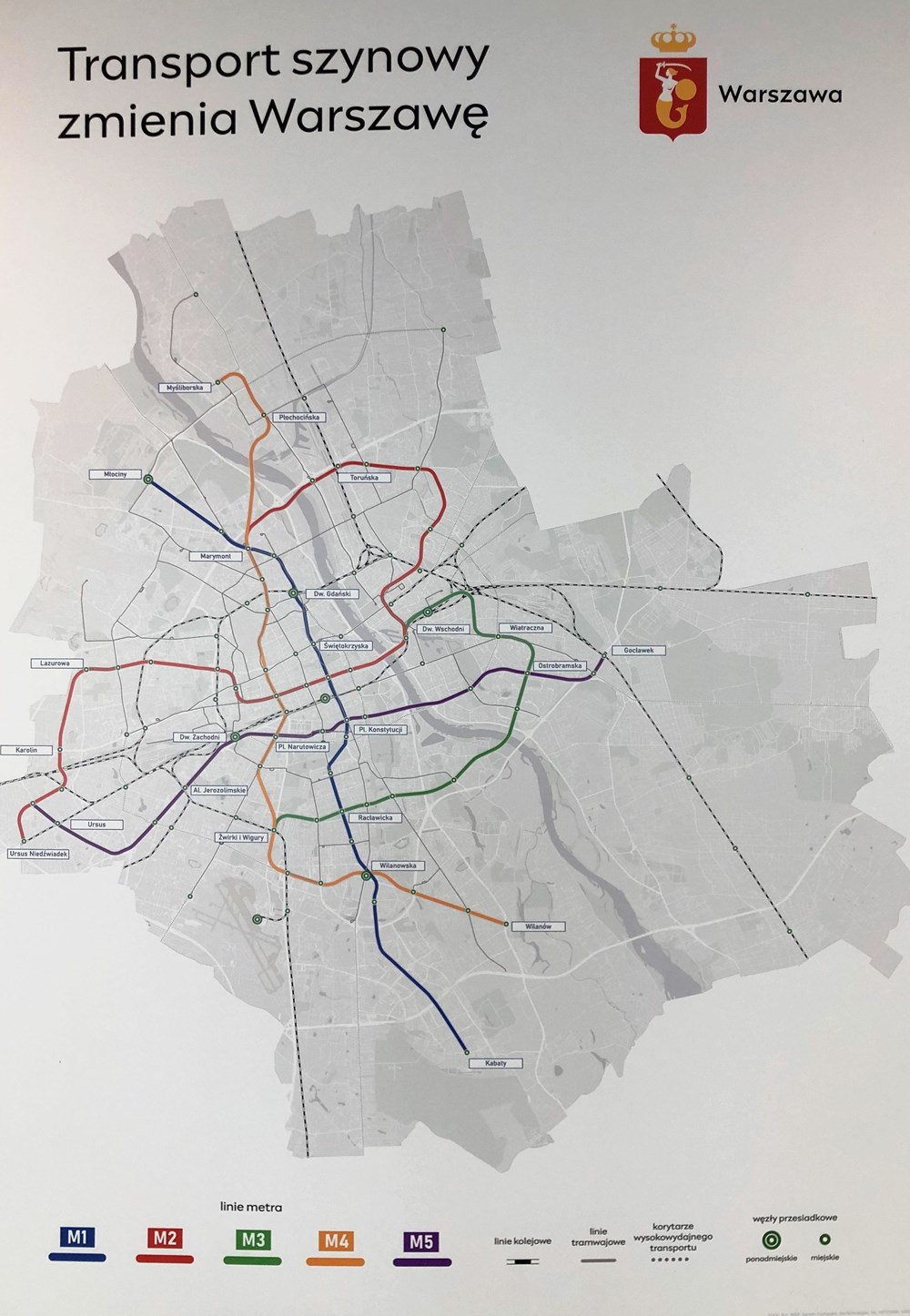 mat. UM WarszawaW dokumencie przewidziano łącznie pięć linii metra. Linia M1 prowadzi z Kabat do Młocin – z