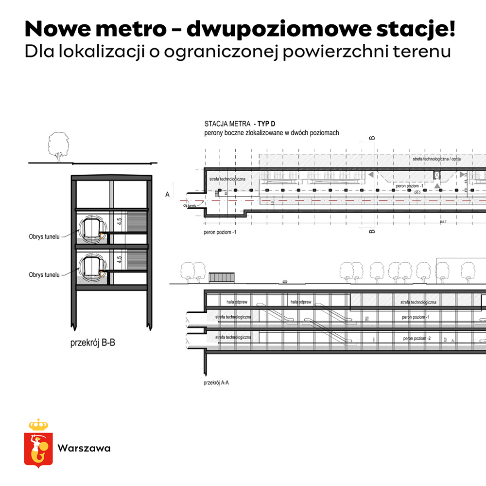 mat. UM WarszawaStacje dwupoziomowe i wszystko pod ziemiąPrzedstawiono też przykładowe rozwiązania techniczne dla nowych stacji, odmienne od dotychczas stosowanych. – Planowane są stacje dwupoziomowe [jeden peron pod drugim – red.] w miejscach z ograniczoną przestrzenią oraz stacje przesiadkowe w obrębie jednego peronu [układ dwóch równoległych peronów z przesiadkami w jednym kierunku na jednym peronie – red.]. To efekt doświadczeń z funkcjonowania przesiadek między I a II linią. Stacje mają być estetyczne, przyjazne dla środowiska, sensowne pod względem kosztu i oszczędne w eksploatacji – mówi Trzaskowski. Takie piętrowe stacje zaplanowano na V linii metra, wytrasowanej przez gęsto zabudowane Śródmieście Południowe – na Solcu, w rejonie Pięknej, placu Konstytucji i przy Koszykach.