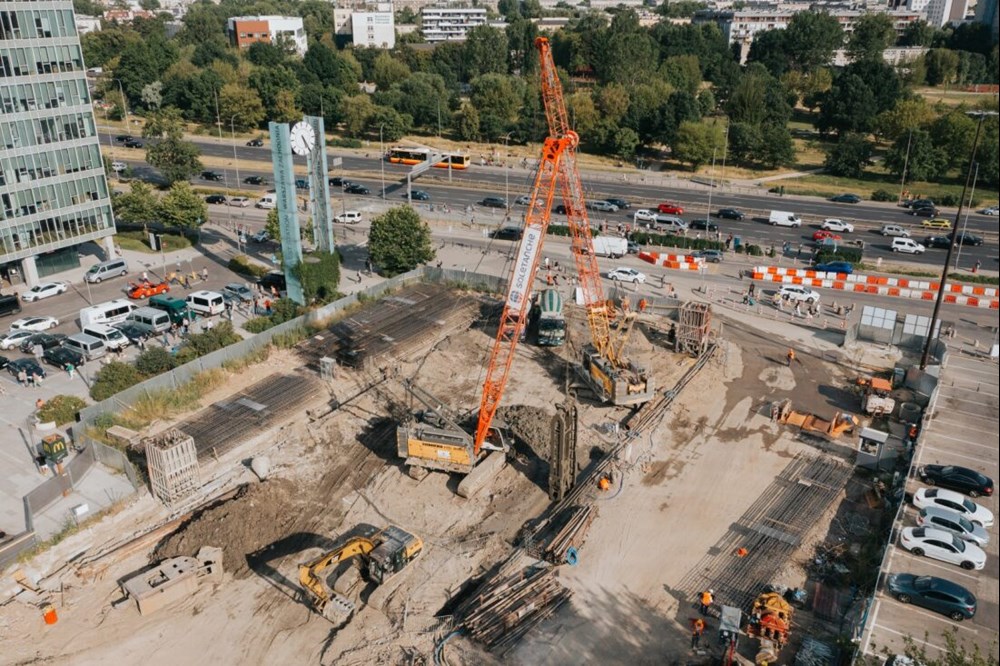 60% ścian szczelinowych na segmencie 7 jest już zrealizowanych. – Tempo prac na tym segmencie oceniam jako bardzo sprawne. Pracujemy w trybie zmianowym. Nie przeszkadzają nam utrudnienia jakie mieliśmy na przykład na segmencie 5, gdzie z obu stron placu kursowały pociągi, co utrudniało nam dostawy. Z uwagi na okres wakacyjny odbiór materiałów realizowany sprawnie. Na pewno jest tu więcej, kolizji które musimy wziąć pod uwagę realizując nasz zakres jak na przykład tunel pieszy łączący dwa dworce kolejowy z autobusowym. Mobilizację zestawu do ścian szczelinowych zaczęliśmy pod koniec czerwca, a 6 lipca rozpoczęliśmy kopanie pierwszej sekcji. Obecnie mamy zrealizowane 60% zakresu ścian szczelinowych na udostępnionym obszarze. Zostaną do zrealizowania najbardziej newralgiczne sekcje w bliskim sąsiedztwie istniejącego wejścia do podziemia – relacjonuje Łukasz Pluta, kierownik Robót odpowiedzialny za realizacje zakresu ścian szczelinowych.