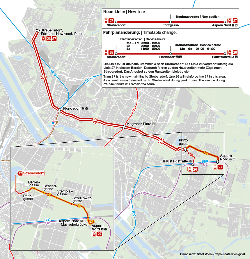W Wiedniu ruszyła nowa linia tramwajowa nr 27, łącząca Floridsdorf i Donaustadt. Ze Strebersdorfu tramwaje linii 27 jadą po istniejącej linii 26 do Prinzgasse, a stamtąd nową, 2,4-kilometrową trasą wzdłuż przyszłej stacji Hirschstettner Hauptallee do Aspern Nord. Pasażerowie mogą przesiąść się na trzy linie metra (U6, U1, U2), a także na liczne linie tramwajowe i autobusowe oraz na pociągi podmiejskie S-Bahn.
