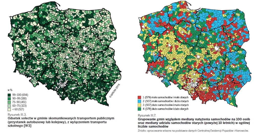 Dwie mapy opisujące wykluczenie transportowe. Pierwsza określa dostępność do transportu publicznego w sołectwach, druga wskazuje na ilość i wiek samochodów, które jeżdżą tam po drogach. Widać wyraźną zbieżność, szczególnie w centralnych rejonach kraju. Tam, gdzie nie dojeżdża autobus, mieszkańcy muszą polegać na własnych samochodach, w dodatku są to zwykle pojazdy kilkunastoletnie, kupowane za niewielkie pieniądze. Co również ciekawe, na pierwszej mapce można dostrzec grancie zaborów, co jest najpewniej związane z gęstością sieci kolejowej, ale też można gdzieniegdzie dostrzec granice dawnych, "małych" województw. Źródło: Instytut Rozwoju Wsi i Rolnictwa/Facebook