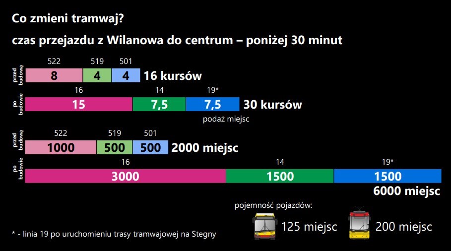 LINIA 501 Likwidacja linii – zastąpią ją linie tramwajowe 14, 16 i 19, które będą zapewniały połączenia Miasteczka Wilanów, Stegien i Dolnego Mokotowa z ulicą Marszałkowska, Dworcem Centralnym, stacjami metra Politechnika (linia M1), Centrum (linia M1) oraz Świętokrzyska (linie M1 i M2). Połączenia tramwajowe będą również oferowały wyższą częstotliwość kursowania, niż dotychczas trzy linie autobusowe (czyli 501, 519 i 522) obsługujące Wilanów oraz trzykrotnie większą liczbę miejsc dla pasażerów (ok. 6 tys. miejsc zamiast 2 tys. w godzinach szczytu).