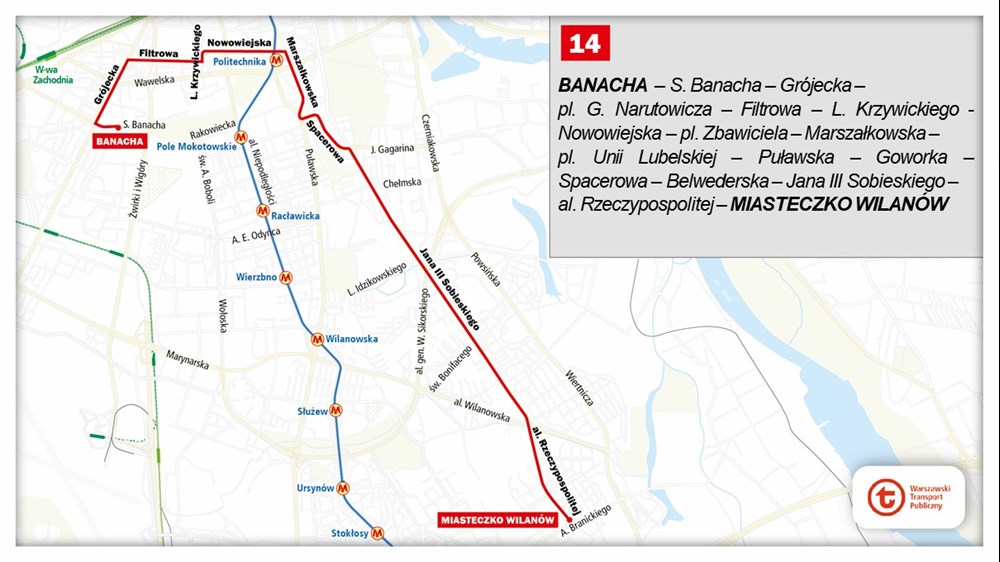 14: BANACHA – S. Banacha – Grójecka – pl. G. Narutowicza – Filtrowa – L. Krzywickiego – Nowowiejska – pl. Zbawiciela – Marszałkowska – pl. Unii Lubelskiej – Puławska – Goworka – Spacerowa – Belwederska – Jana III Sobieskiego – al. Rzeczypospolitej – MIASTECZKO WILANÓW