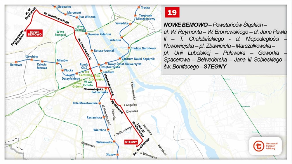 19: NOWE BEMOWO – Powstańców Śląskich – al. W. Reymonta – W. Broniewskiego – al. Jana Pawła II – T. Chałubińskiego – al. Niepodległości – Nowowiejska – pl. Zbawiciela – Marszałkowska – pl. Unii Lubelskiej – Puławska – Goworka – Spacerowa – Belwederska – Jana III Sobieskiego – św. Bonifacego – STEGNY