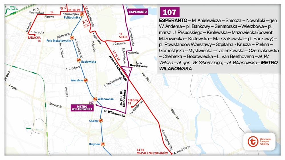 107: ESPERANTO – M. Anielewicza – Smocza (powrót: Smocza – Dzielna – Okopowa – M. Anielewicza) – Nowolipki – gen. W. Andersa – pl. Bankowy – Senatorska – Wierzbowa – pl. marsz. J. Piłsudskiego – Królewska – Mazowiecka (powrót: Mazowiecka – Królewska – Marszałkowska – pl. Bankowy) – pl. Powstańców Warszawy – Szpitalna – Krucza – Piękna – Górnośląska – Myśliwiecka – Łazienkowska – Czerniakowska – Chełmska – Bobrowiecka – L. van Beethovena – al. W. Witosa – al. gen. W. Sikorskiego (powrót: al. gen W. Sikorskiego – Jana III Sobieskiego – L. van Beethovena – Bobrowiecka) – al. Wilanowska – METRO WILANOWSKA