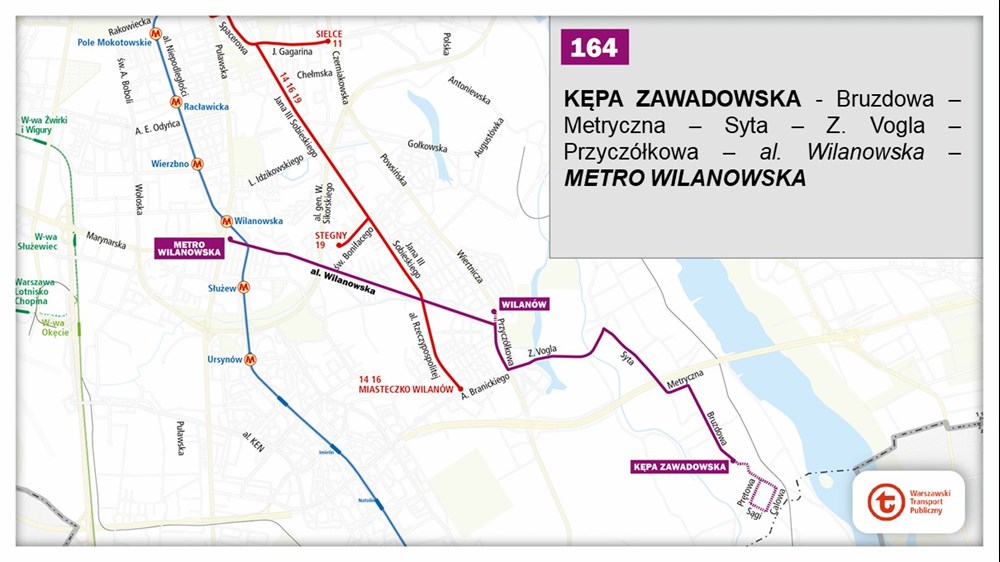 164: KĘPA ZAWADOWSKA – Bruzdowa – Metryczna – Syta – Z. Vogla – Przyczółkowa – al. Wilanowska – METRO WILANOWSKA