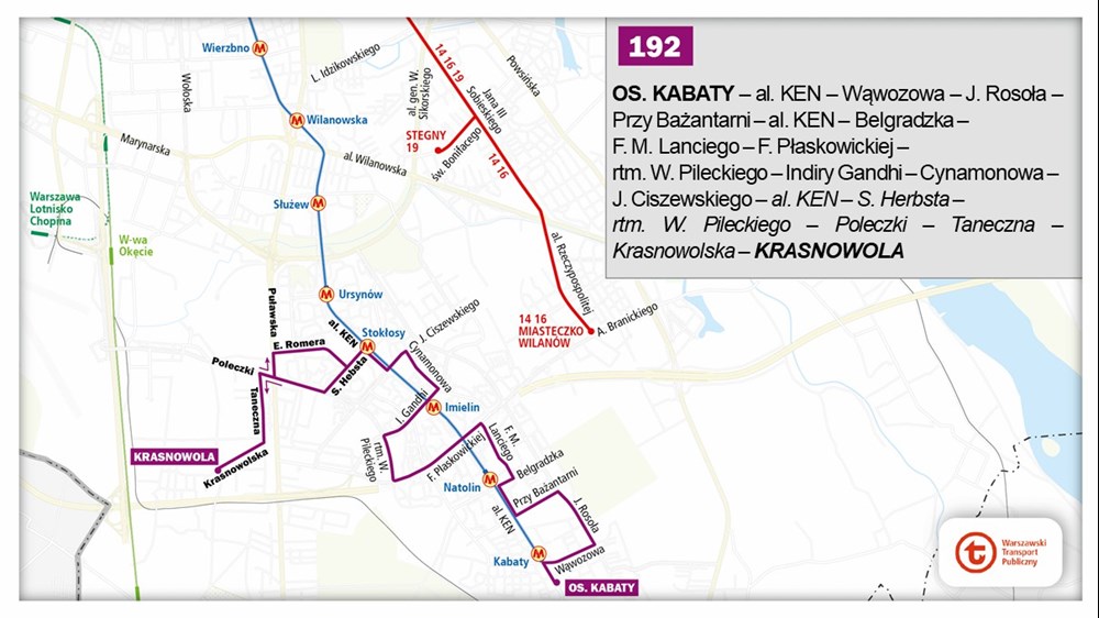 192: OS. KABATY – al. KEN – Wąwozowa – J. Rosoła – Przy Bażantarni – al. KEN – Belgradzka – F. M. Lanciego – F. Płaskowickiej – rtm. W. Pileckiego – Indiry Gandhi – Cynamonowa – J. Ciszewskiego – al. KEN – S. Herbsta – rtm. W. Pileckiego – Poleczki (powrót: Poleczki – Puławska – E. Romera – S. Herbsta) – Taneczna – Krasnowolska – KRASNOWOLA