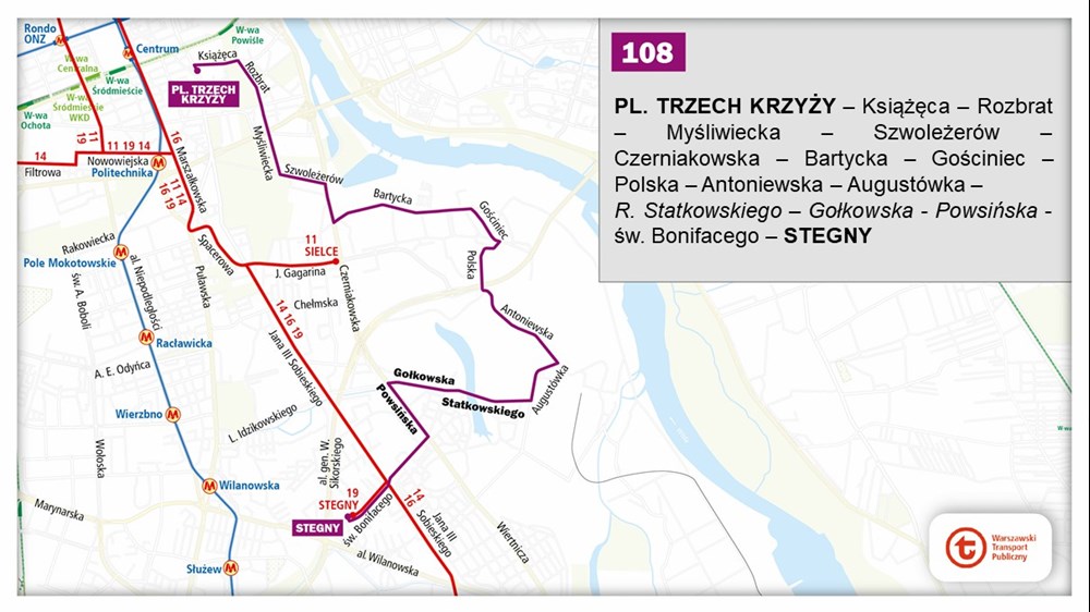 108: PL. TRZECH KRZYŻY – Książęca – Rozbrat – Myśliwiecka – Szwoleżerów – Czerniakowska – Bartycka – Gościniec – Polska – Antoniewska – Augustówka – R. Statkowskiego – Gołkowska – Powsińska – św. Bonifacego – STEGNY