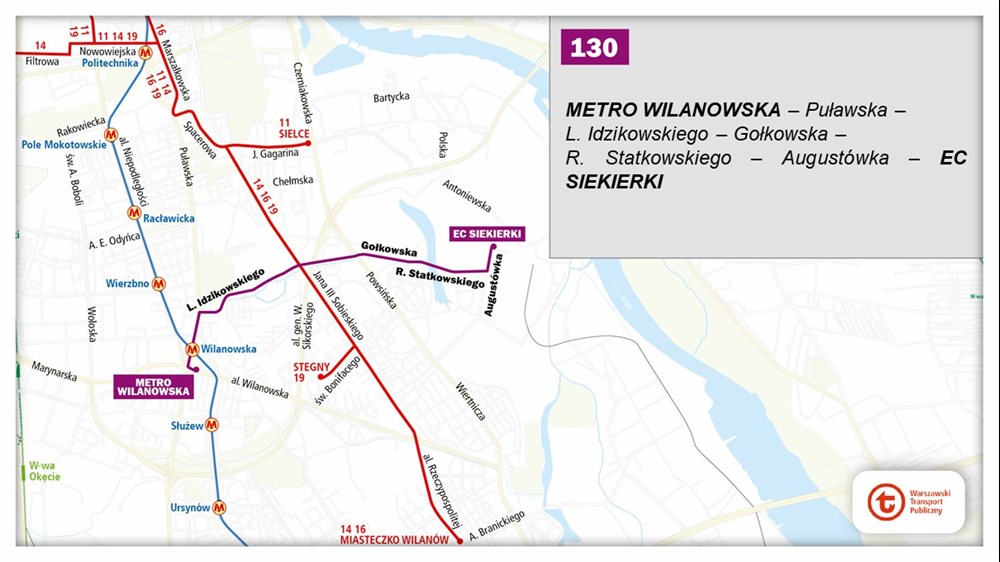 130: METRO WILANOWSKA – Puławska – L. Idzikowskiego – Gołkowska – R. Statkowskiego – Augustówka – EC SIEKIERKI