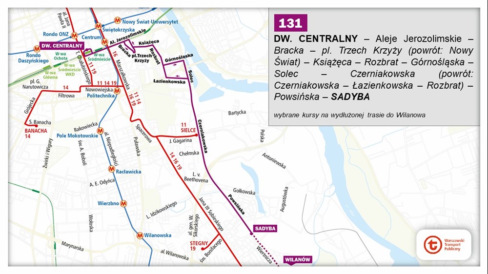 LINIA 131 Autobusy linii 131 nie będą kursowały odcinkiem trasy, który przejęły tramwaje linii 11 czyli od Sielc przez ulicę J. Gagarina, Spacerową, Goworka, L. Waryńskiego i Marszałkowską do linii metra M1 i centrum miasta. Zamiast tego pojadą ulicą Czerniakowską, przez Powiśle i pl. Trzech Krzyży do Alej Jerozolimskich. W połączeniu Powiśla ze Śródmieściem zastąpią linię 517. Zachowane zostaną wydłużone kursy linii do Wilanowa.