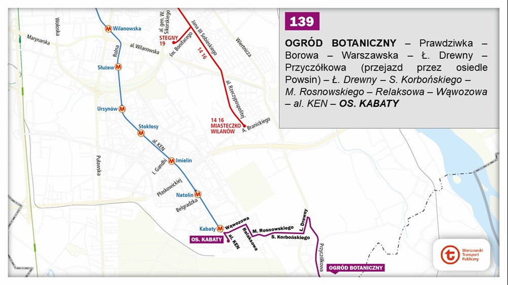 LINIA 139 O skierowanie autobusów linii 139 do najbliższej stacji metra oraz do szkoły przy ulicy M. Zaruby postulowali mieszkańcy oraz radni dzielnicy Ursynów. I tak, autobusy linii 139 razem z 239 na nowej trasie przejadą przez osiedle Powsin (wzdłuż ulicy Przyczółkowej), a następnie ulicą S. Korbońskiego dojadą do stacji metra na Kabatach. Połączenie Powsina z Wilanowem oraz al. Wilanowską (i stacją metra) zapewnią autobusy linii 519 i 251.